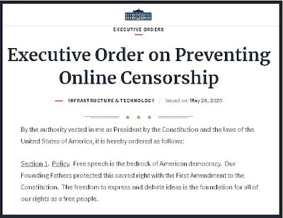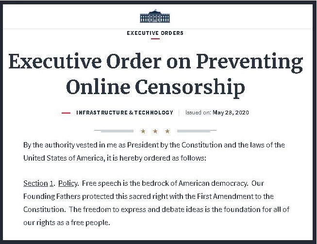 President Trump has issued an Executive Order, which is a form of legally-binding directive to the bureaucrats in the Executive Department, regarding Social Media and private censorship of Internet speech.